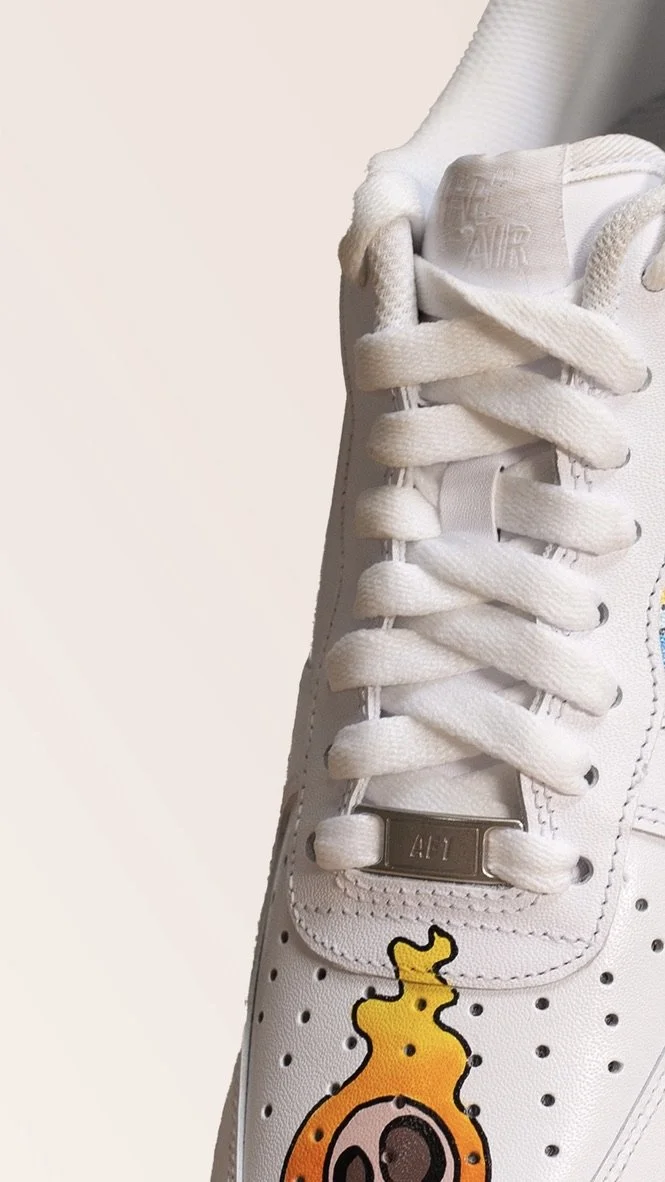 Car force one When thinking about my commissioned shoe artworks, I approach the shoe similarly to an autobiography. Every cartoon illustration is thoughtfully crafted to symbolize different aspects of the individual's life and personality. In this instance, “Car Force One” were commissioned by popular car influencer “POG”. The title “Car force one” nods to POG’s passion for automobiles. All the intricate details of the shoes represent important milestones, events and personal interests of POG’s life, turning the footwear into a narrative canvas. This piece ultimately questions the industrial norms of shoes, advocating for the return of artistry and craftsmanship that has been lost with the mass manufacturing of shoes.